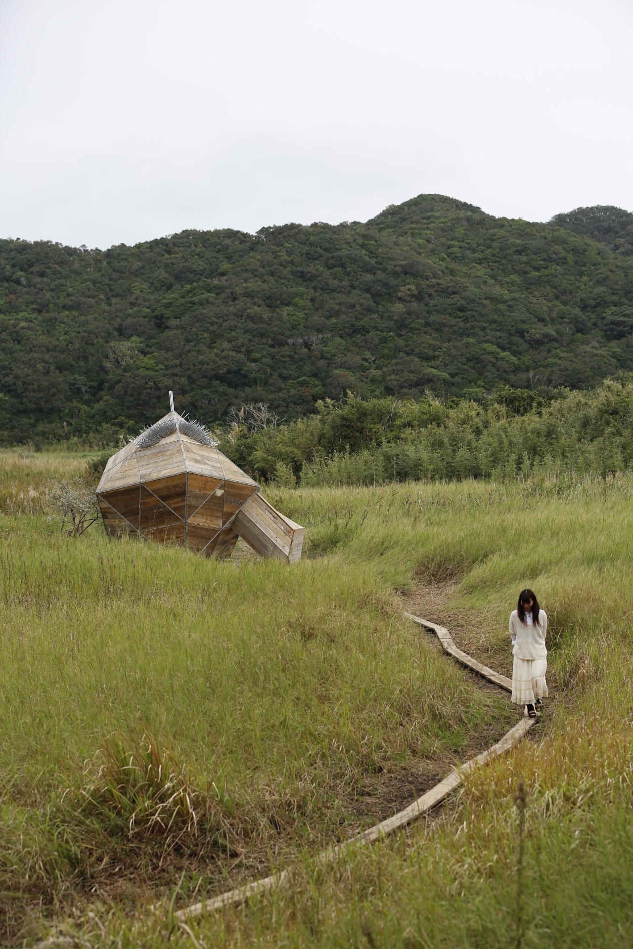 The pipes that admit the light are made from the supporting pillars of greenhouses the walls from the scaffolding boards used in construction sites. The interior walls are daubed with a mix of paint, sand, and shells, and the exterior walls with waste oil. Coral collected from Hirota Beach was used to pave the floor. By shifting our point of view and giving a different value to things that are familiar to us, we are able to approach a cosmic perspective that allows us to reassess our very existence.