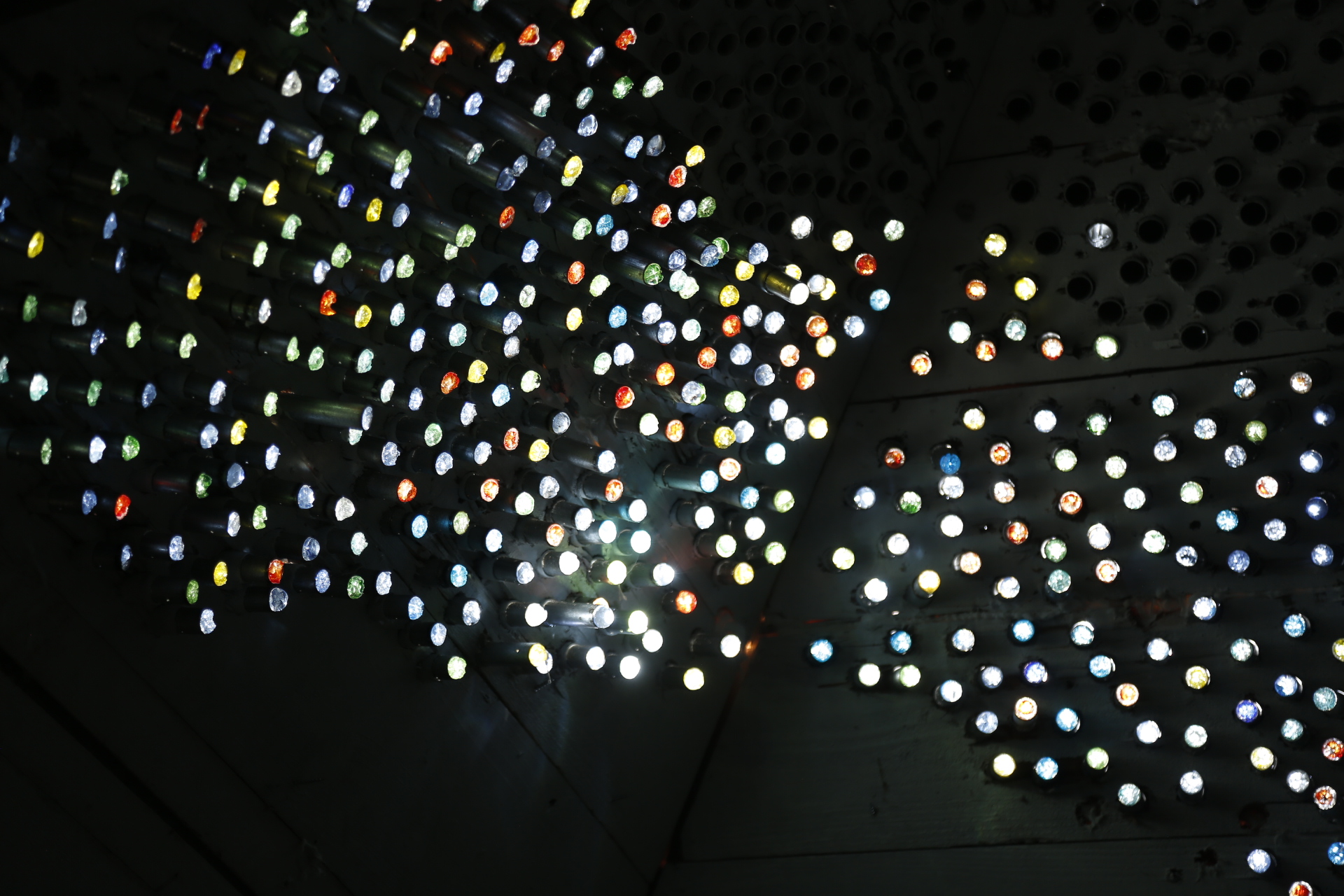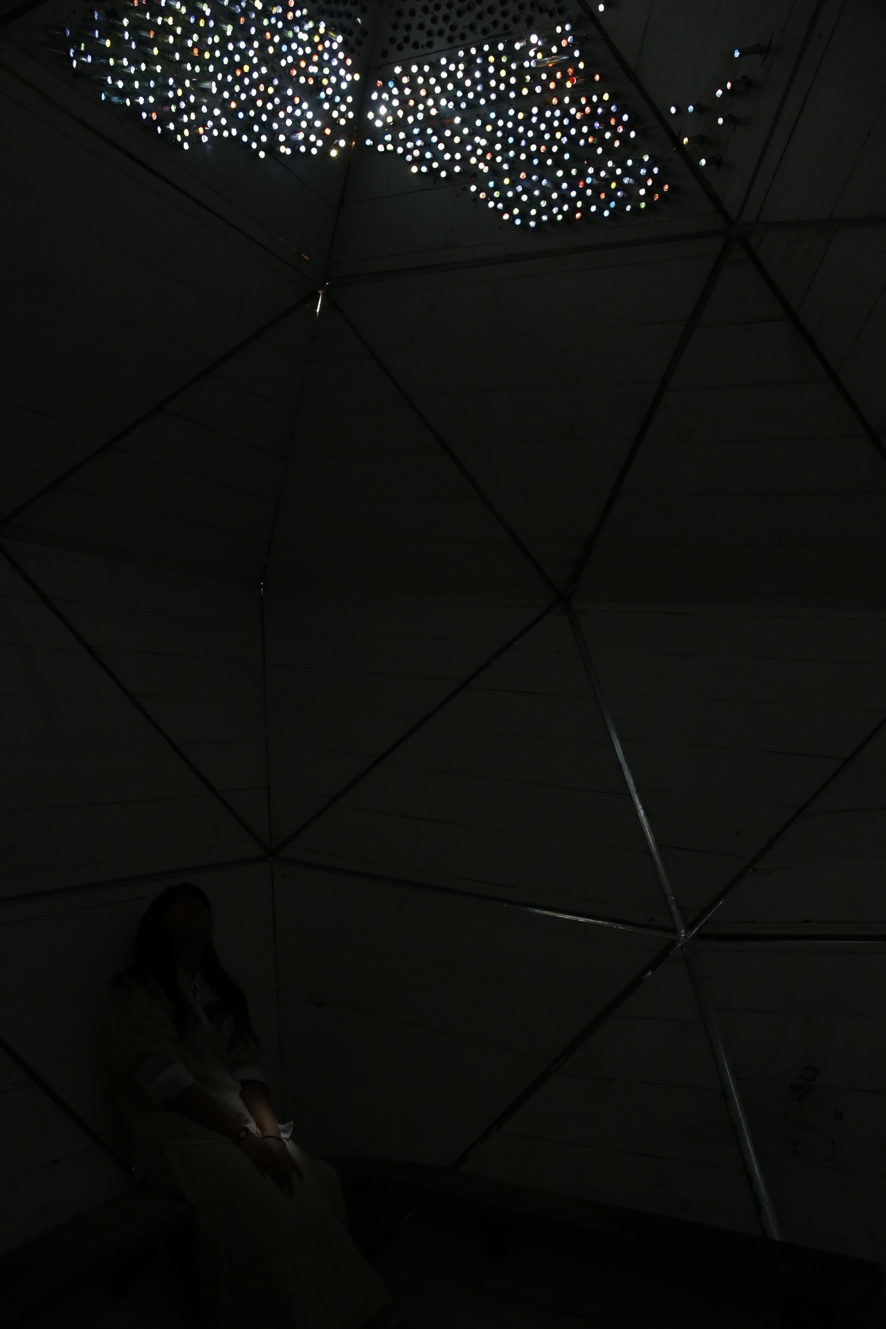 この作品は、草原の中に建てられた作品の内部に入り、地球の自転を体験する作品です。上部には太陽の視直径と南種子町の太陽高度に合わせ、1040本のパイプが取り付けられています。細く長いパイプは太陽光を限定的に透過させ、中に嵌められた40 色のガラス玉は光に異なる色と模様を与えます。地球の自転が数分毎に変化し続ける映像へと変えられます。