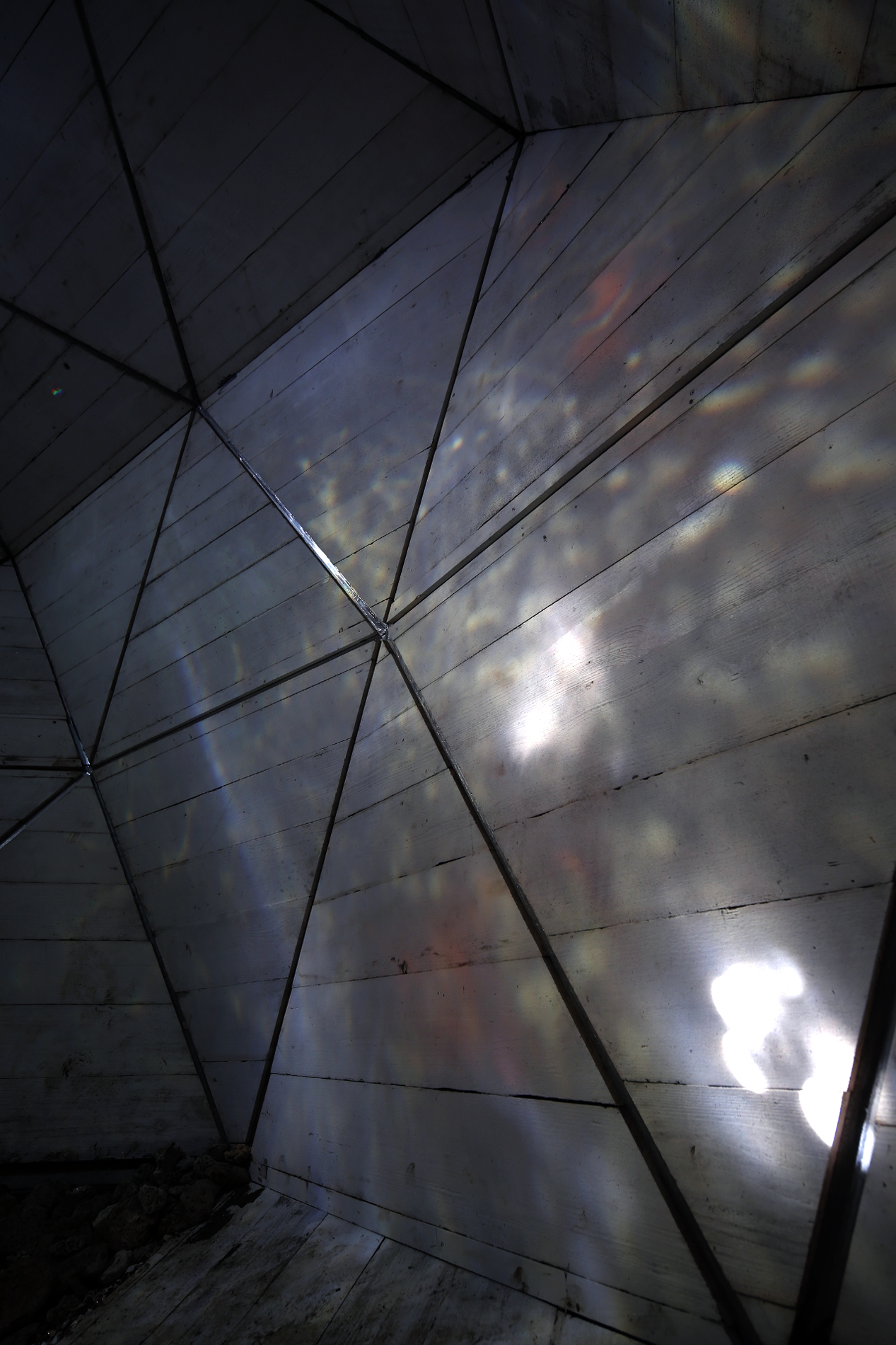 全体の形状は双四角錐反柱という16の正三角形による多面体です。一年を通じて太陽光を取り入れられること、作品内部で光の描く模様が引き伸ばされ、微かな変化をより顕著に見せることを両立させています。