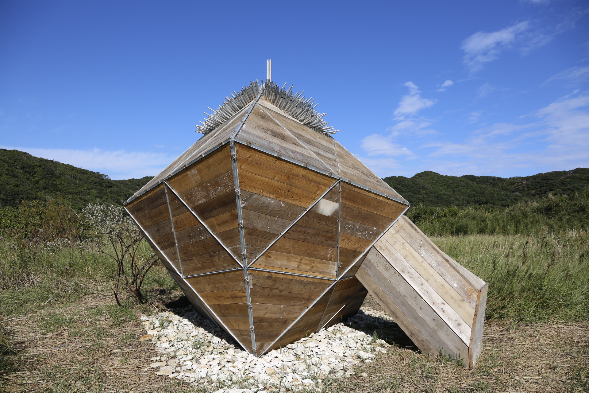 光を取り入れるパイプはビニルハウスの支柱、壁面は建築現場で使われていた足場板、内壁は砂や貝、外壁は廃油で仕上げられ、床には広田海岸で集められた珊瑚が敷き詰められています。視点を変えることで、見慣れたものに別の価値を与えることは、私たちの存在を宇宙から見つめなおす視点に通じるのではないでしょうか。