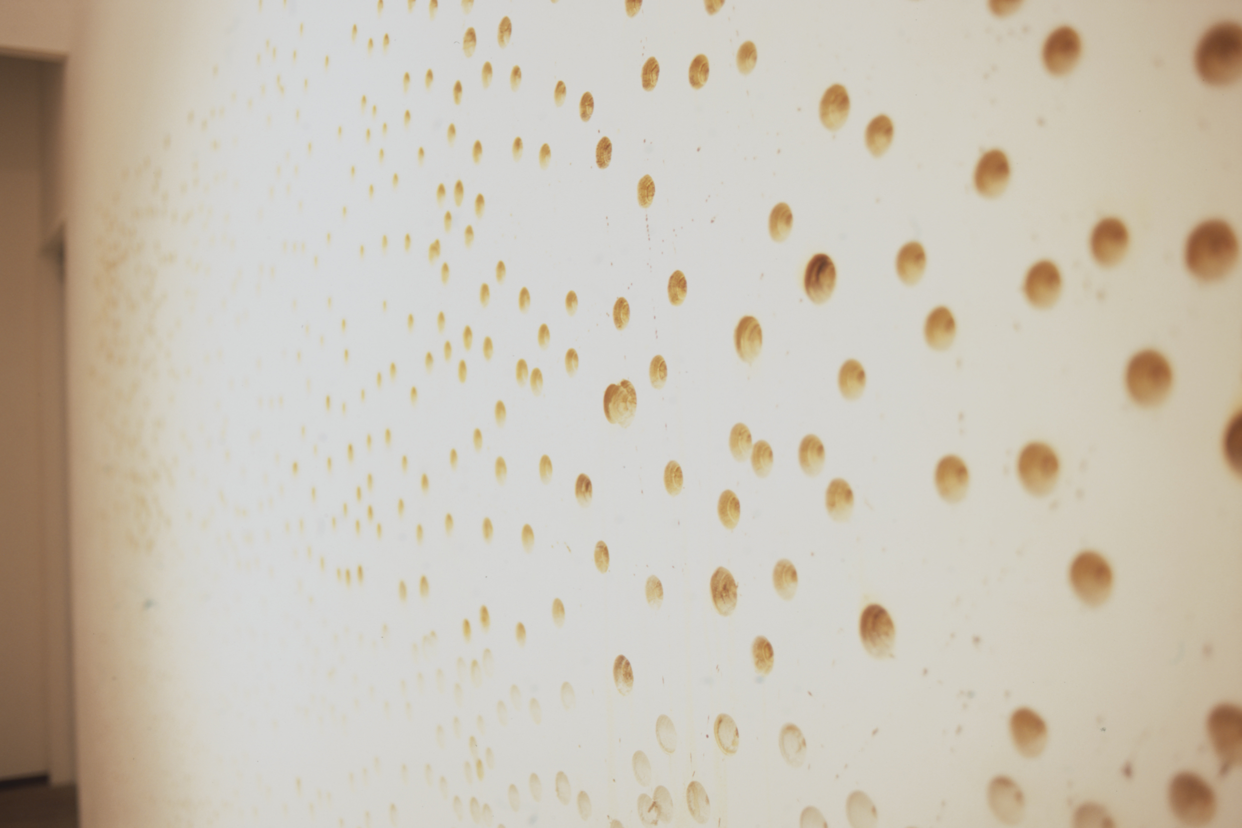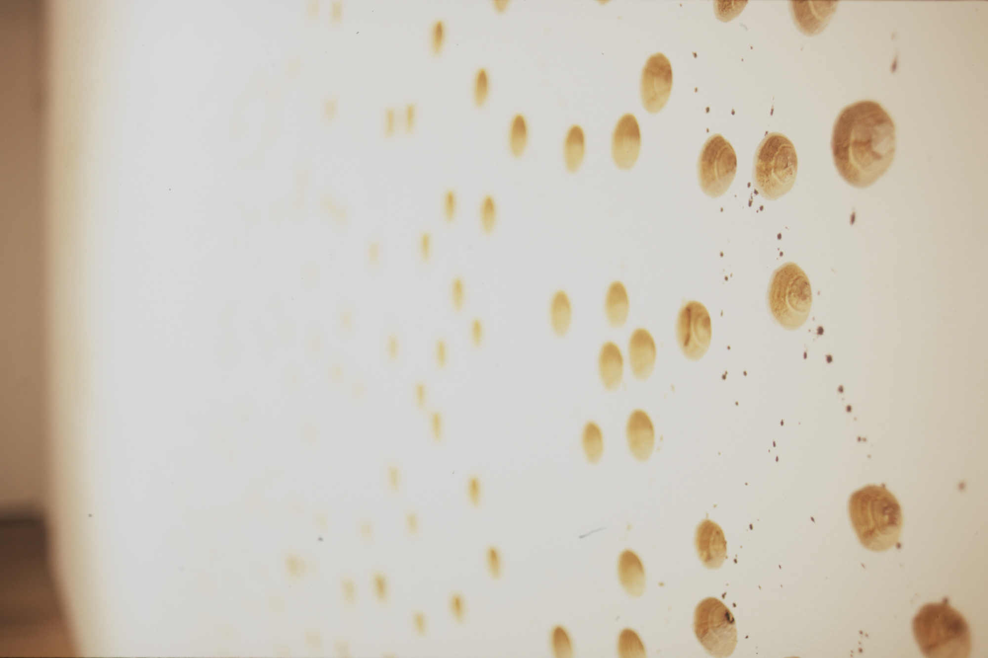 Walking around in the interior, it appears as if light is following the viewer. The title for this work comes from the German “Brocken,” an optical phenomenon that is observed in the mountains. These works glitter in the sunlight, flicker with points of light in the rain, take on a red hue at dusk, and take in the soft light of the moon through the holes by night. The sense of gloom created by these works makes the value of darkness and minute changes in the light all the more conspicuous.