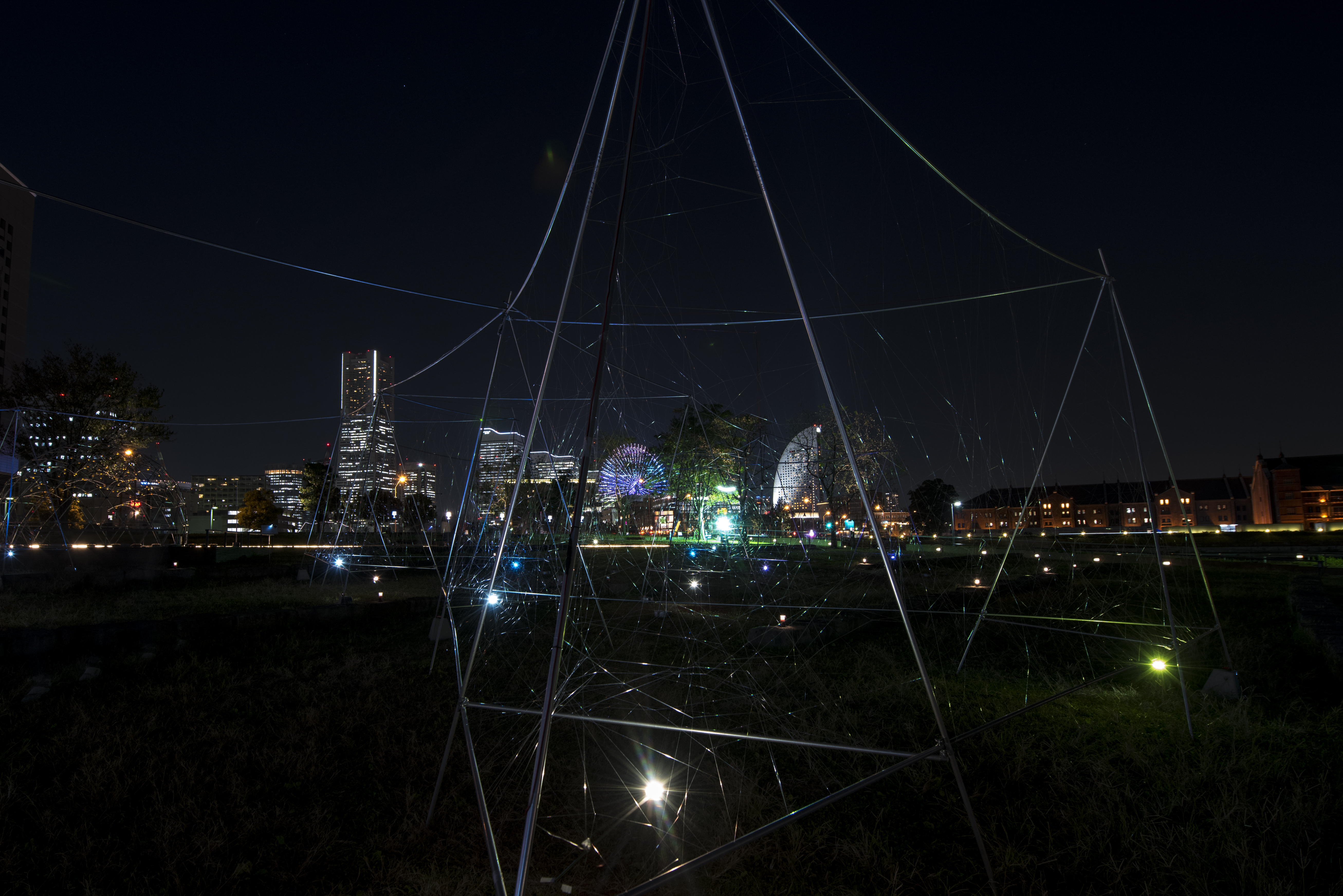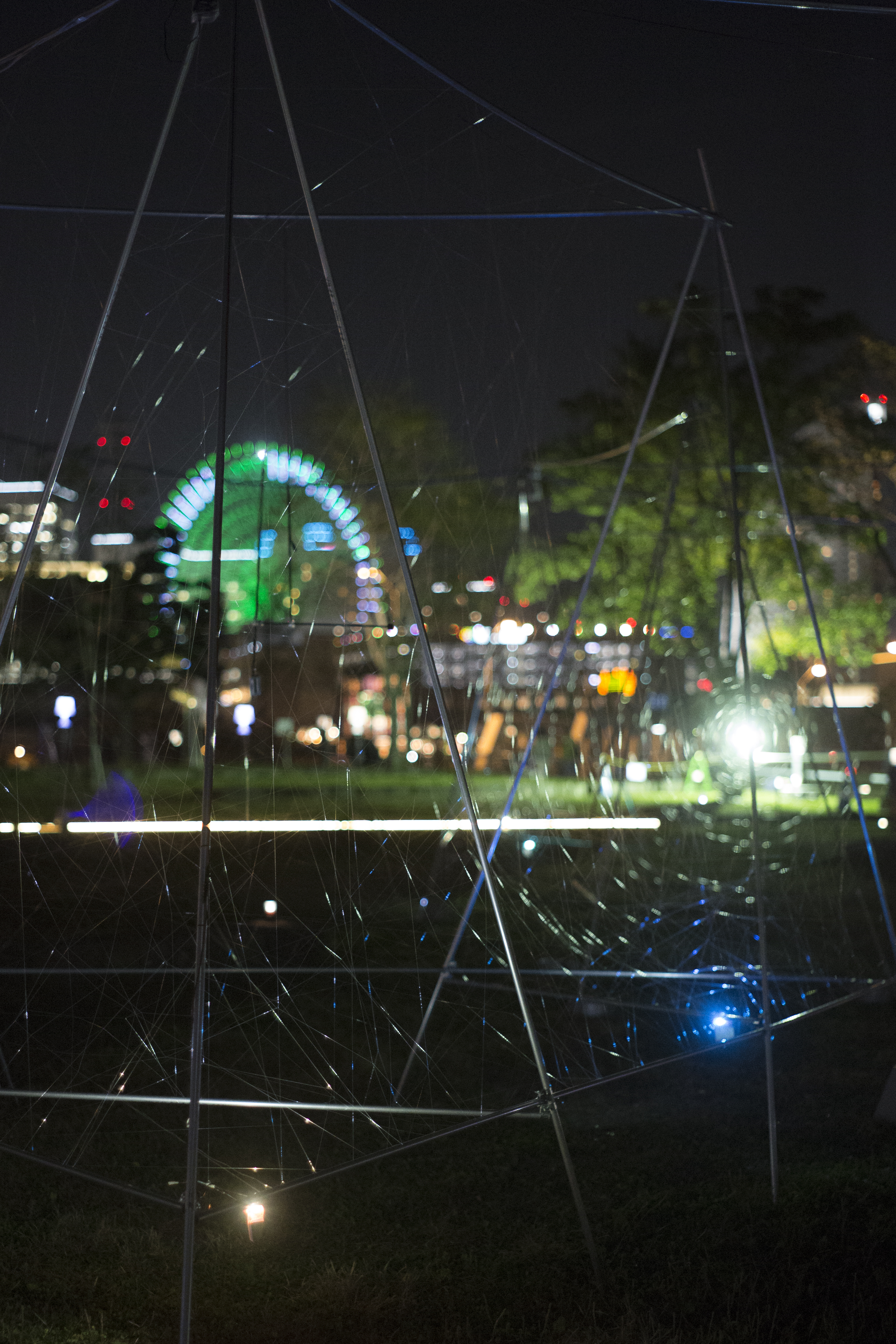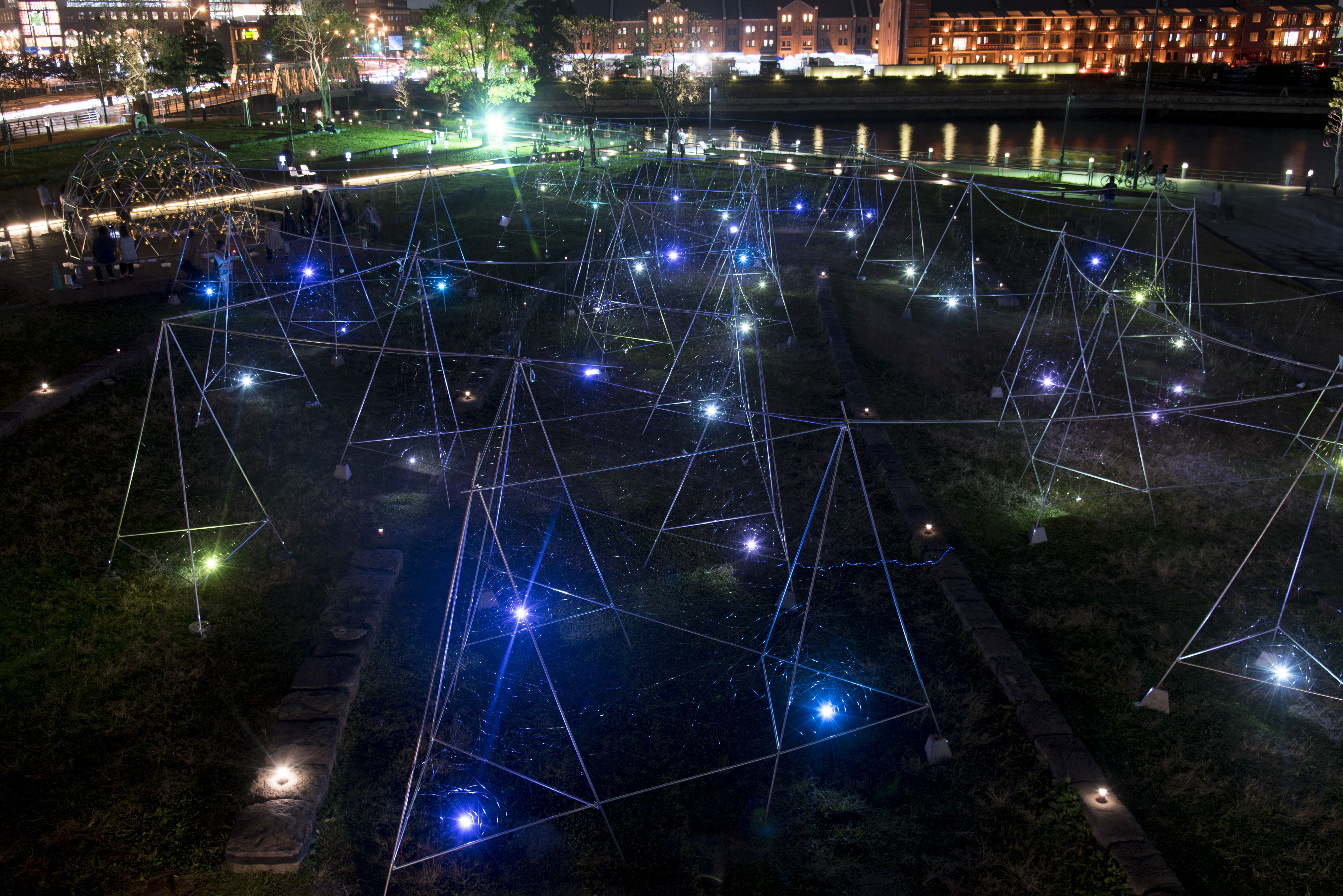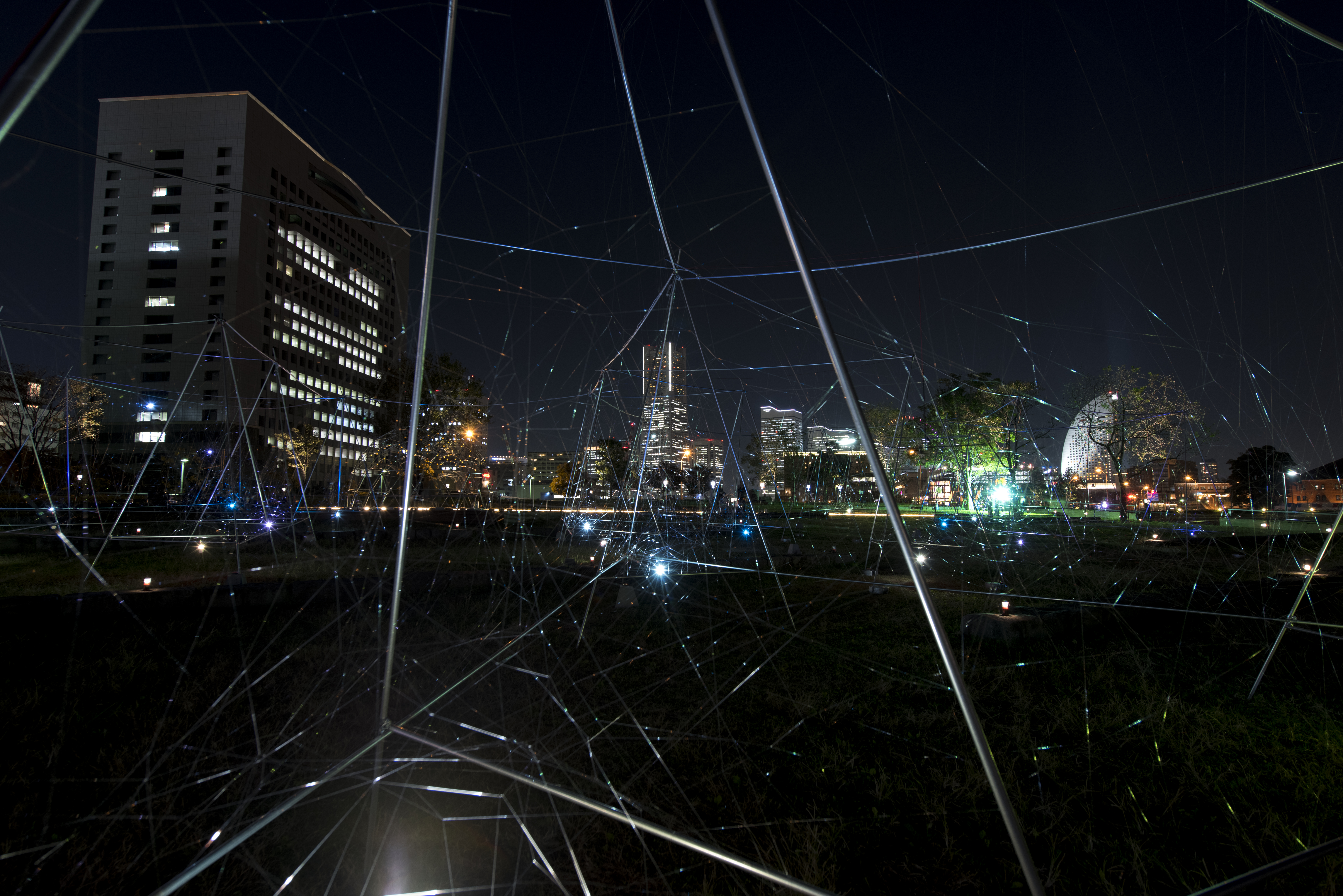 Beyond the universe, Life on earth Photo: Smart-Illumination-Yokohama-2017 Hajime-Kato Zou-no-hana Park/Kanagawa Japan2017Steel, Nylon thread, LED, Color gelW:30m D:60m H:4m