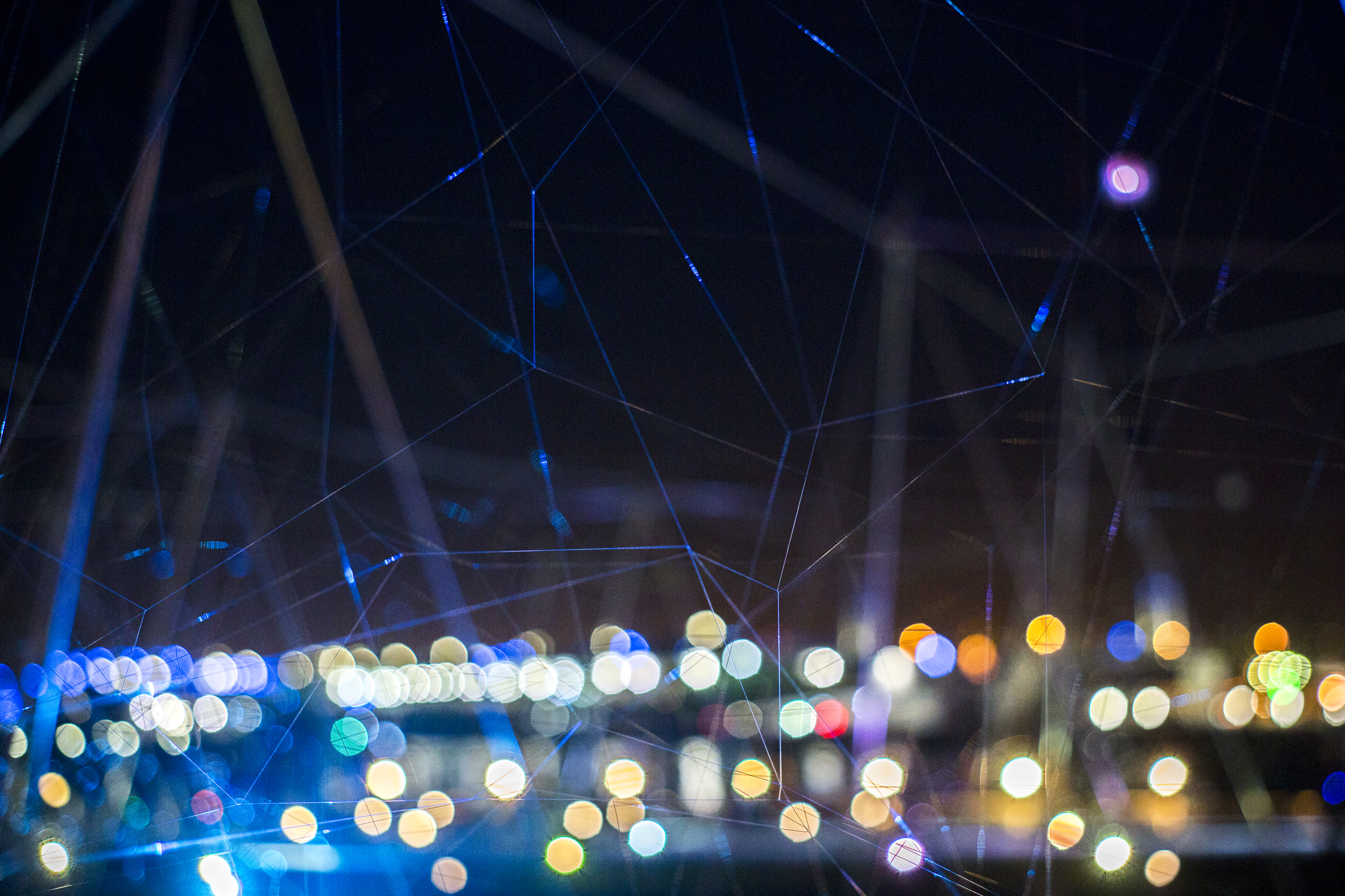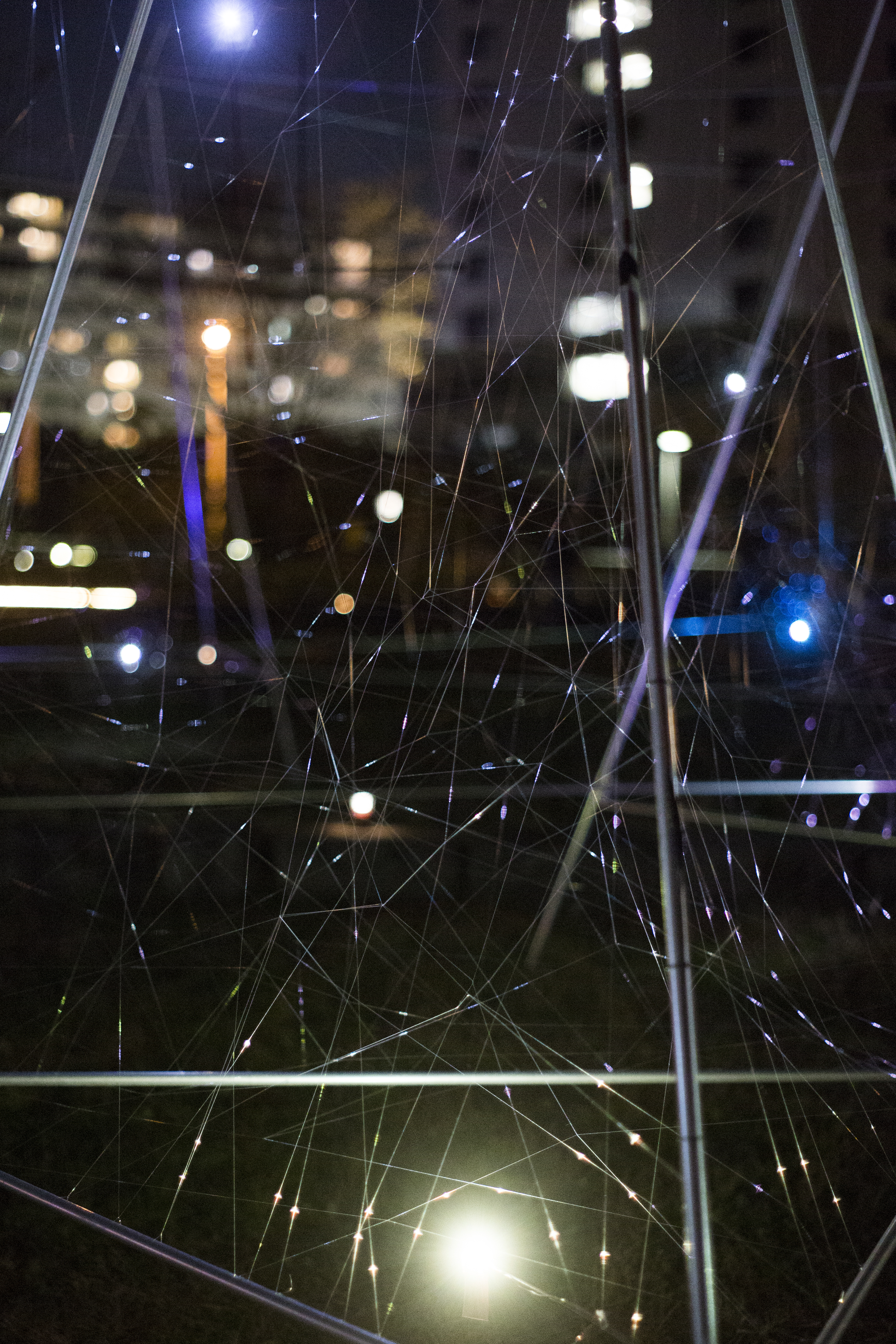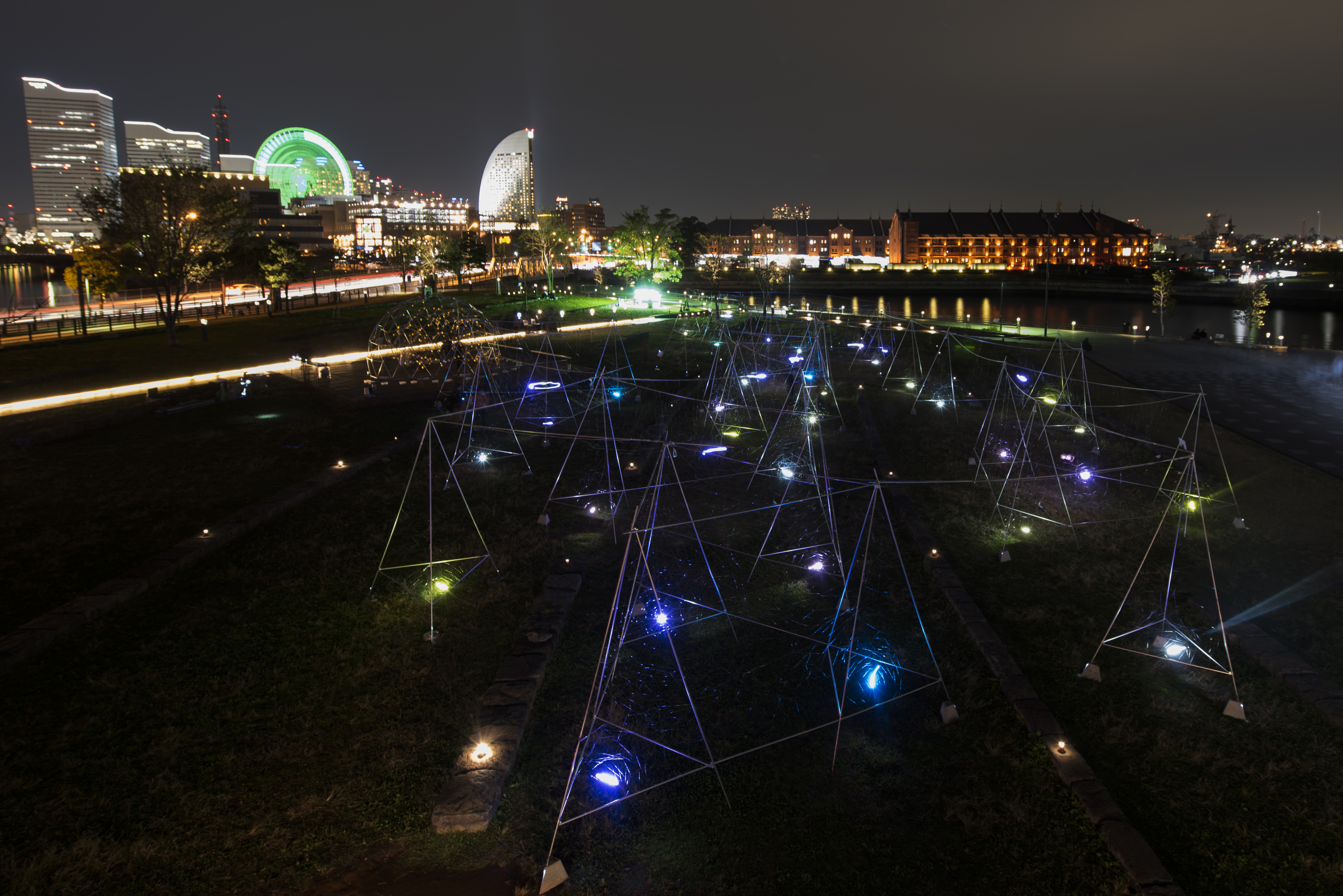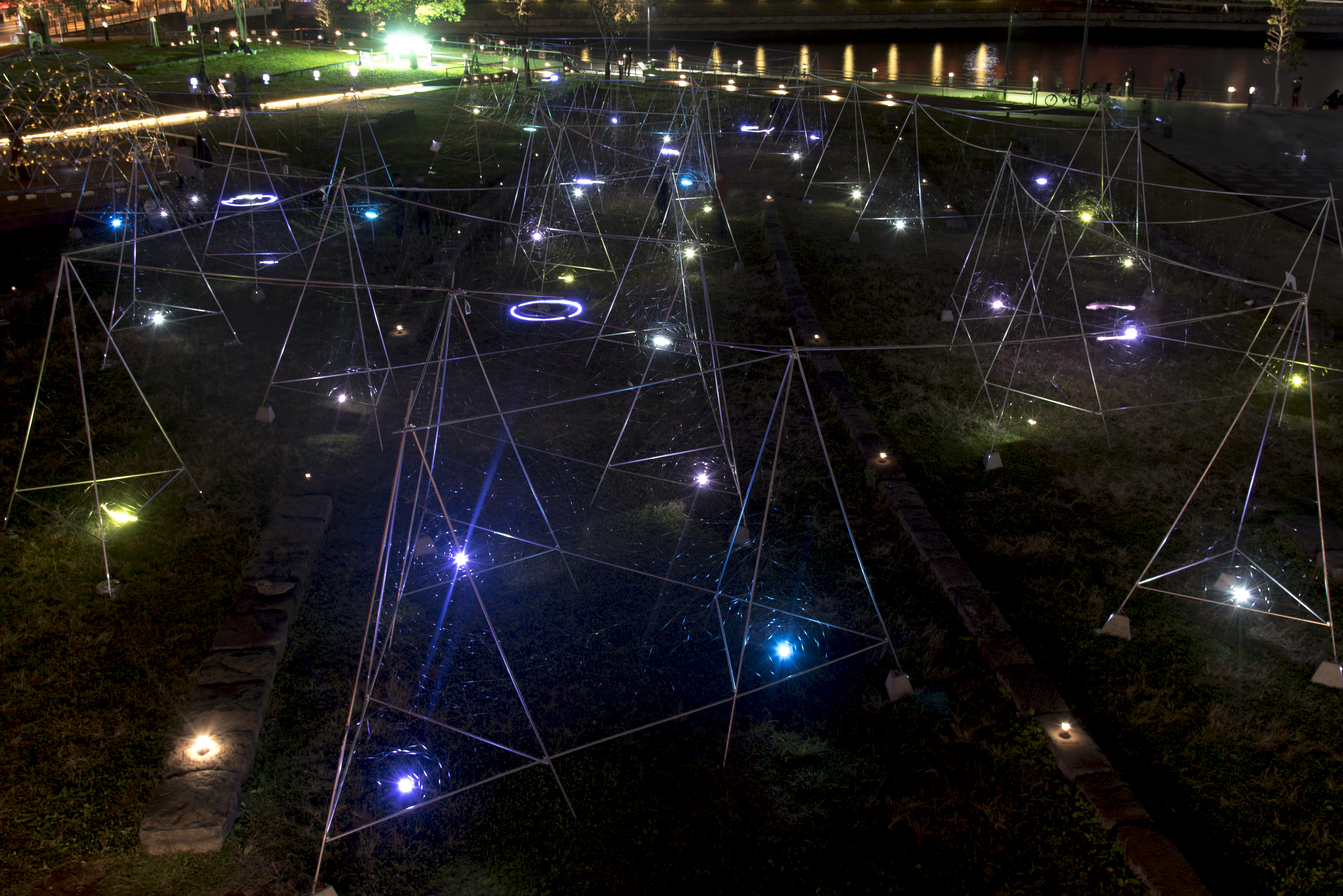 Beyond the universe, Life on earth Photo: Smart-Illumination-Yokohama-2017 Hajime-Kato Zou-no-hana Park/Kanagawa Japan2017Steel, Nylon thread, LED, Color gelW:30m D:60m H:4m