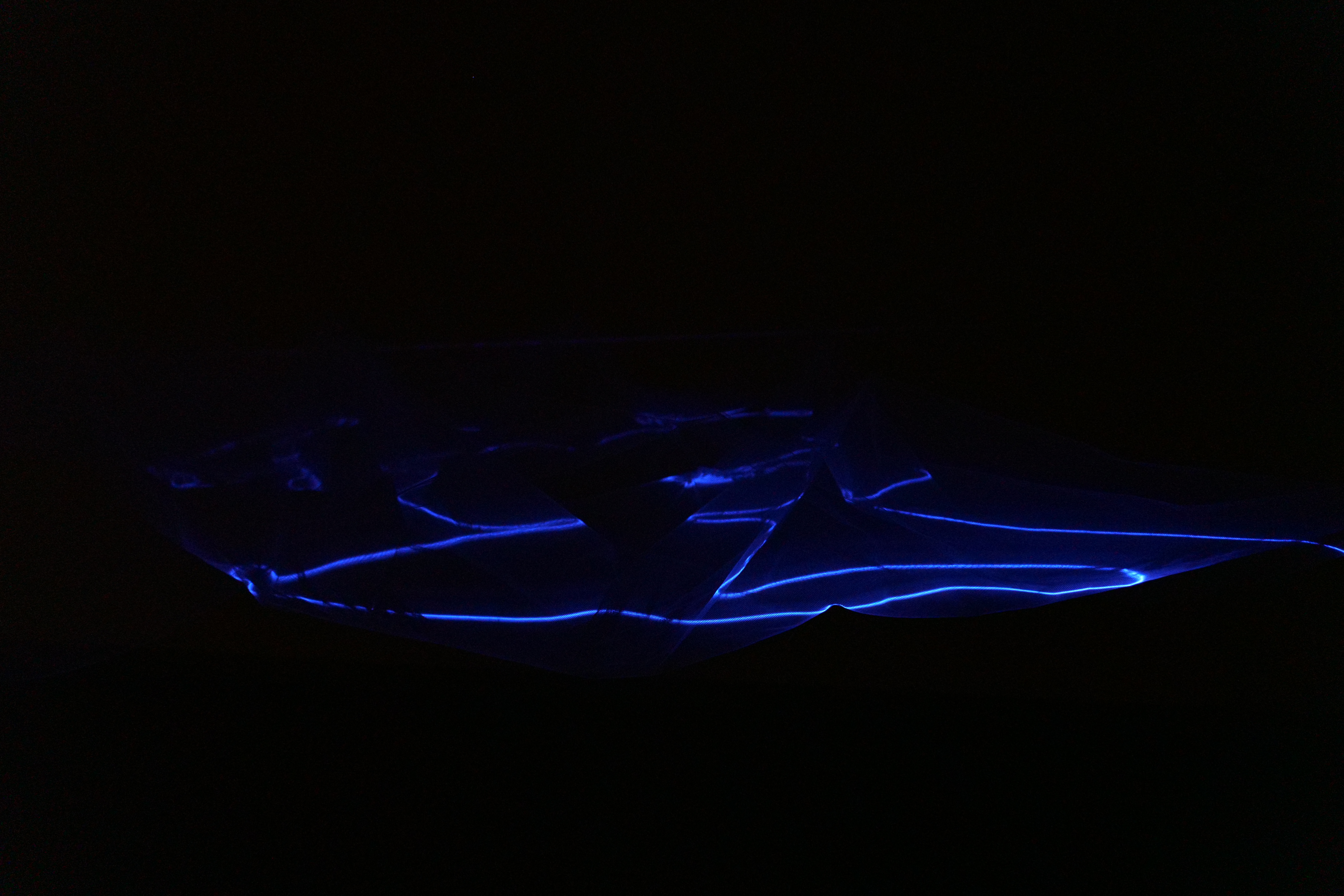 暗闇の中、極めて薄く、密度の低い布が室内中央に、山脈のような形状になるように吊り下げられている。線状のレーザー光がその上をゆっくりと上下し、空中に等高線を描き出す。柔らかな光の曲線が宙を舞い、現れては消えていく。