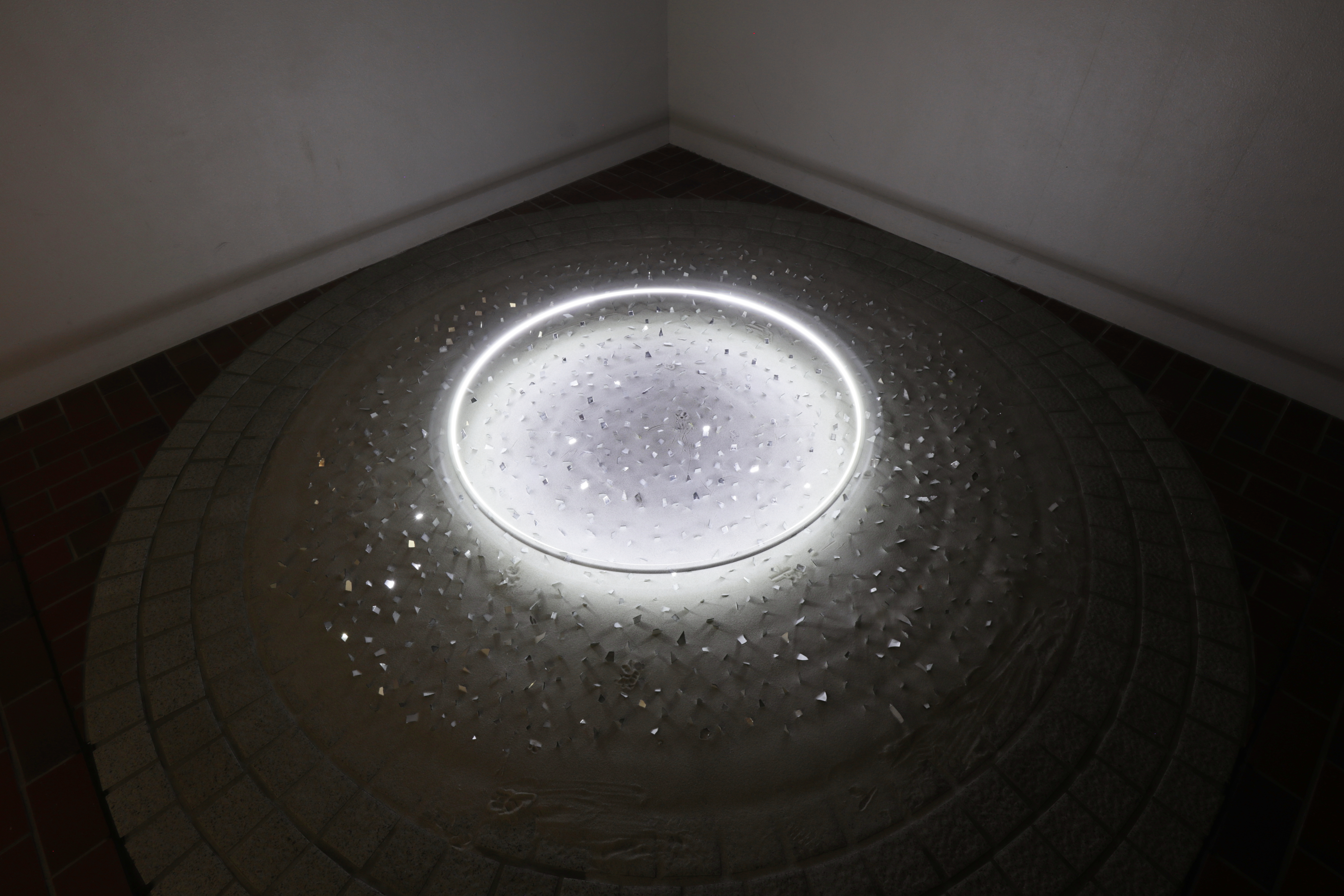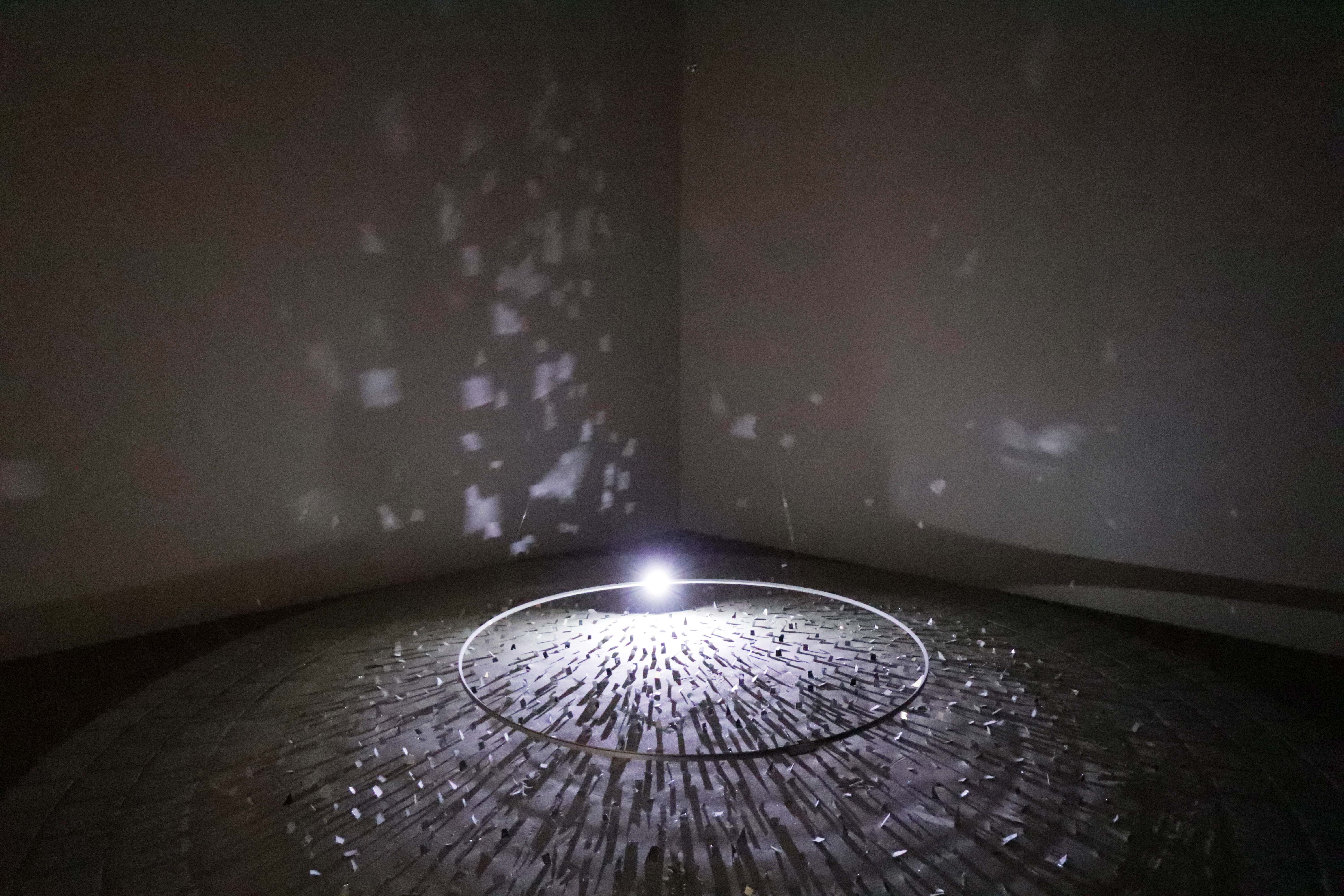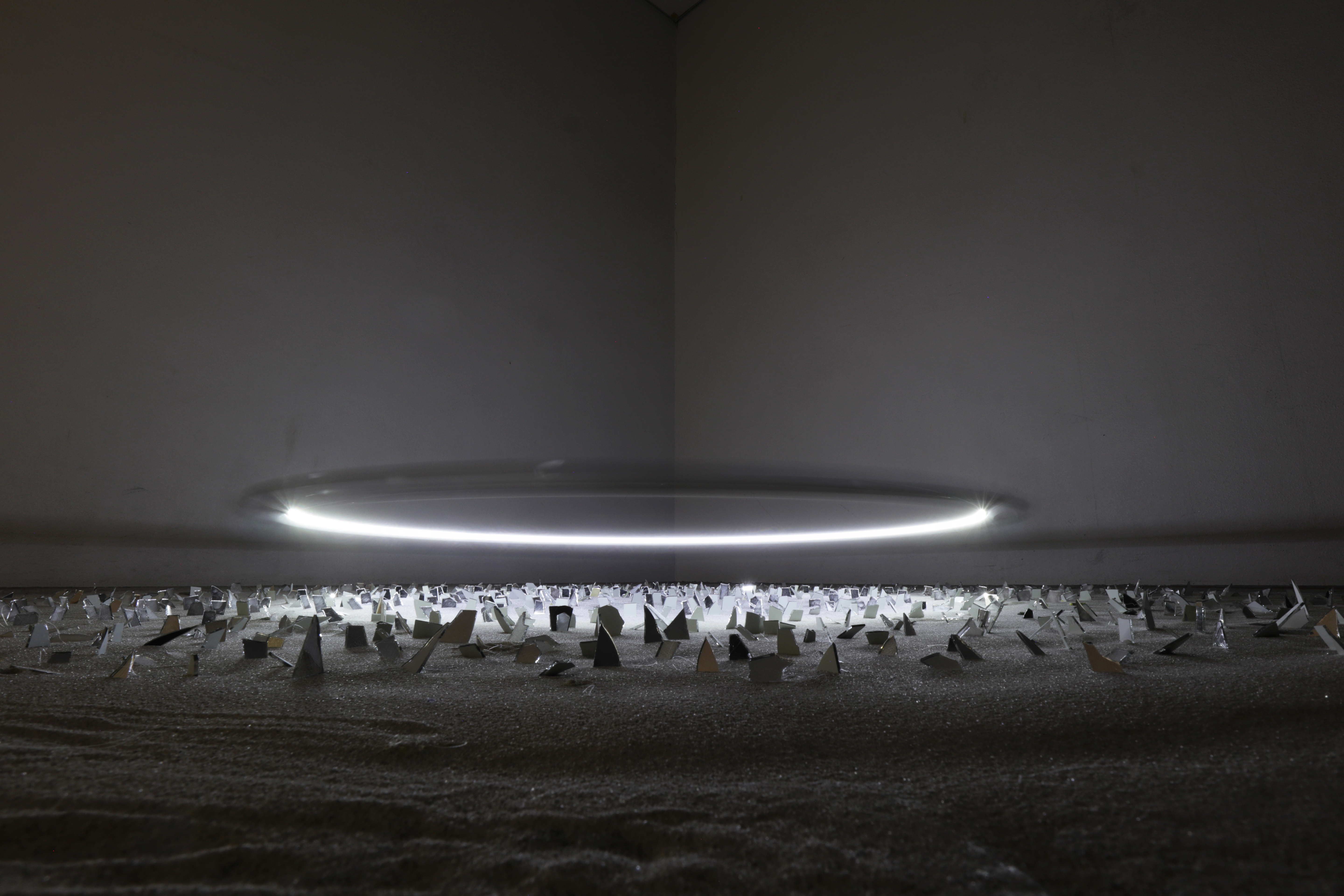 数百の小さな鏡の破片が床に並べられている。天井から吊るされたリングには小さなファンが付けられ、風の力によって水平方向に静かに回転する。リングに取り付けられた一灯のLEDの光を床の鏡が反射し、展示空間に光の破片が飛び散るような映像が映し出される。リングが1回転する間に一度、壁面の角に反射光が集まるように、一つ一つの鏡は厳密な角度で設置されている。角で壁面が切り替わるため、光の破片は、角にゆっくりと集まり、加速して散らばっていく。