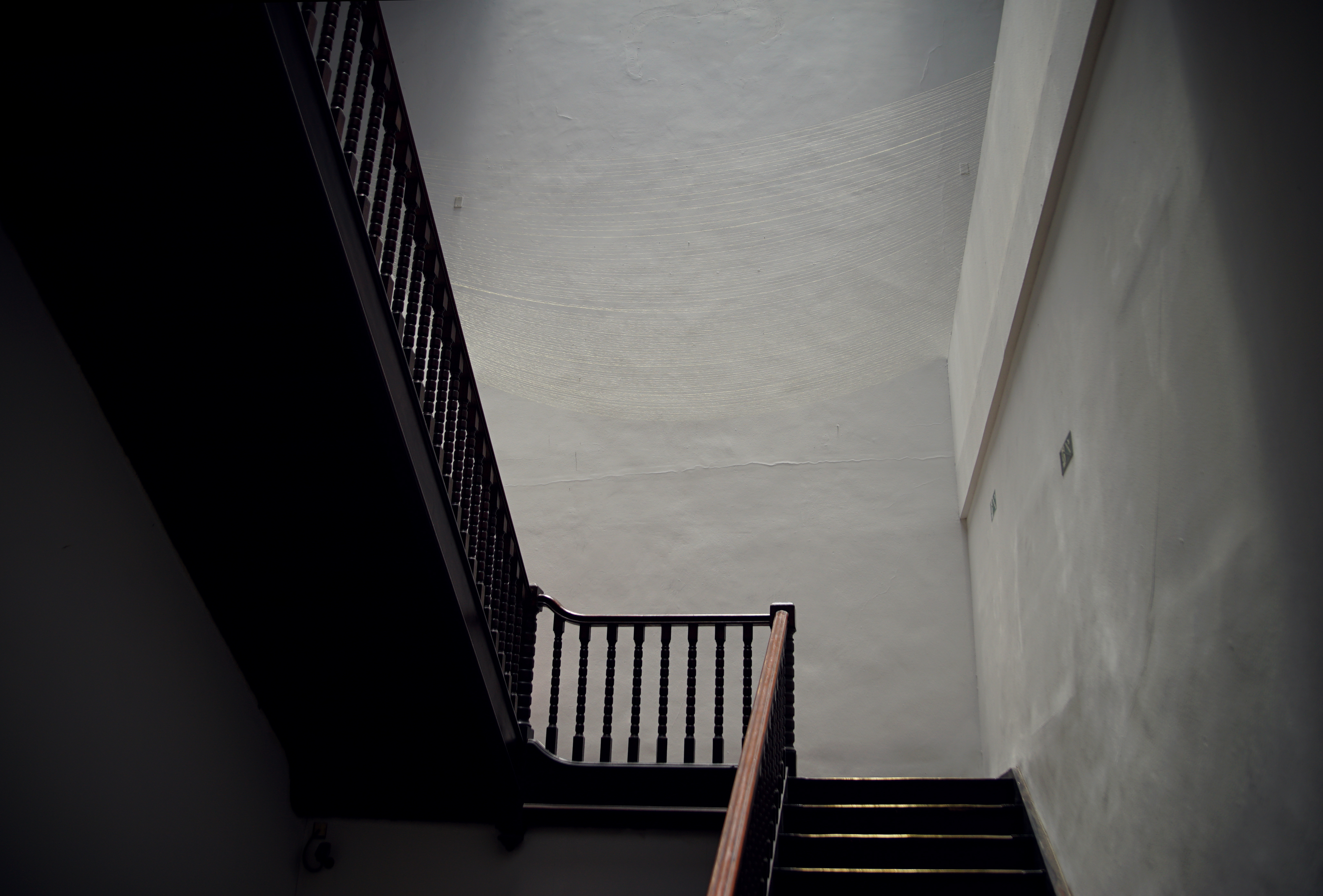 In the open space above the staircase, two hundred pieces of gold thread are suspended in the form of a 3D curved surface. Those threads appear and disappear depending on the shiing sunlight and viewing angles. e threads subtly sway based on any breezes or the viewers’ movements. (T.N.)