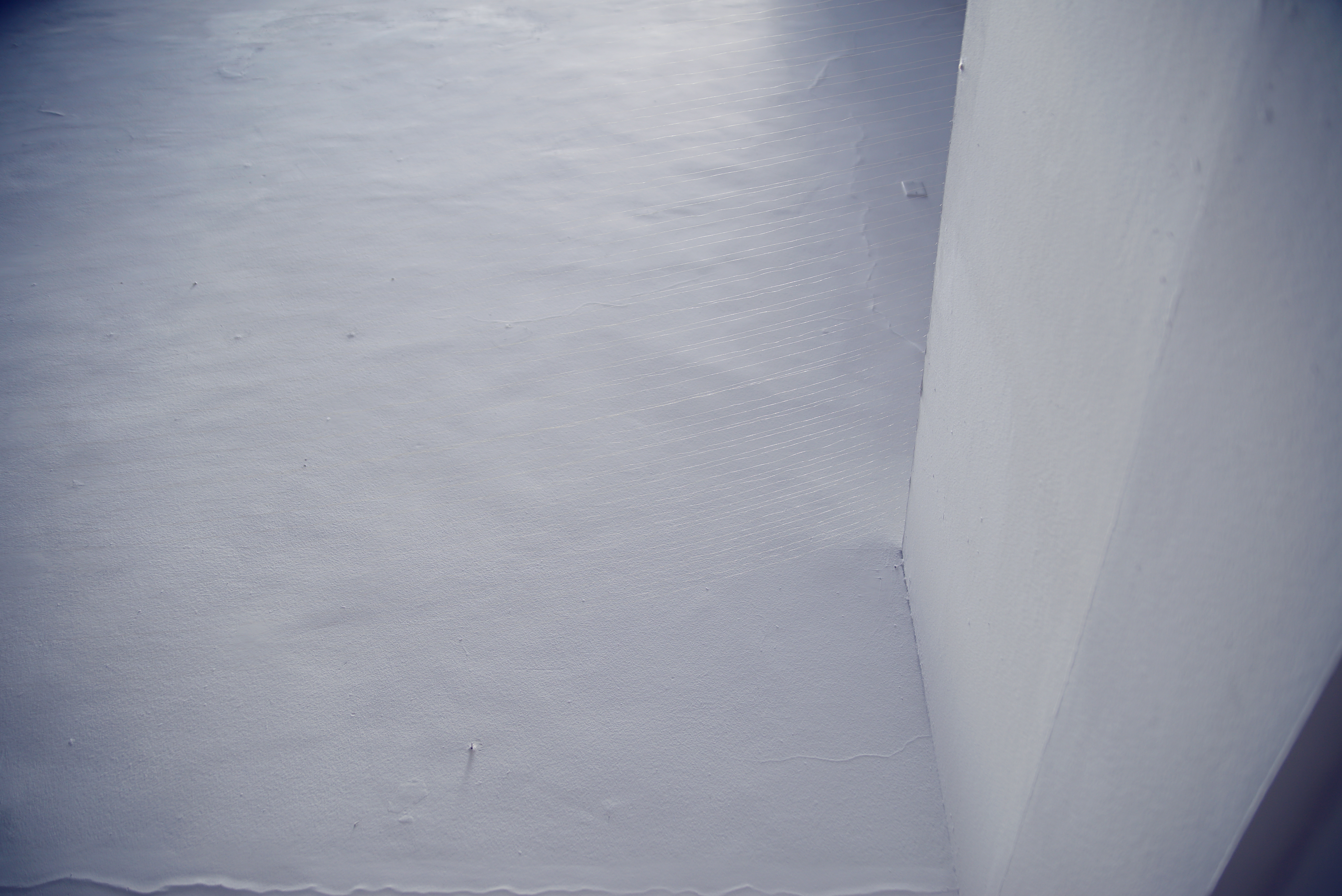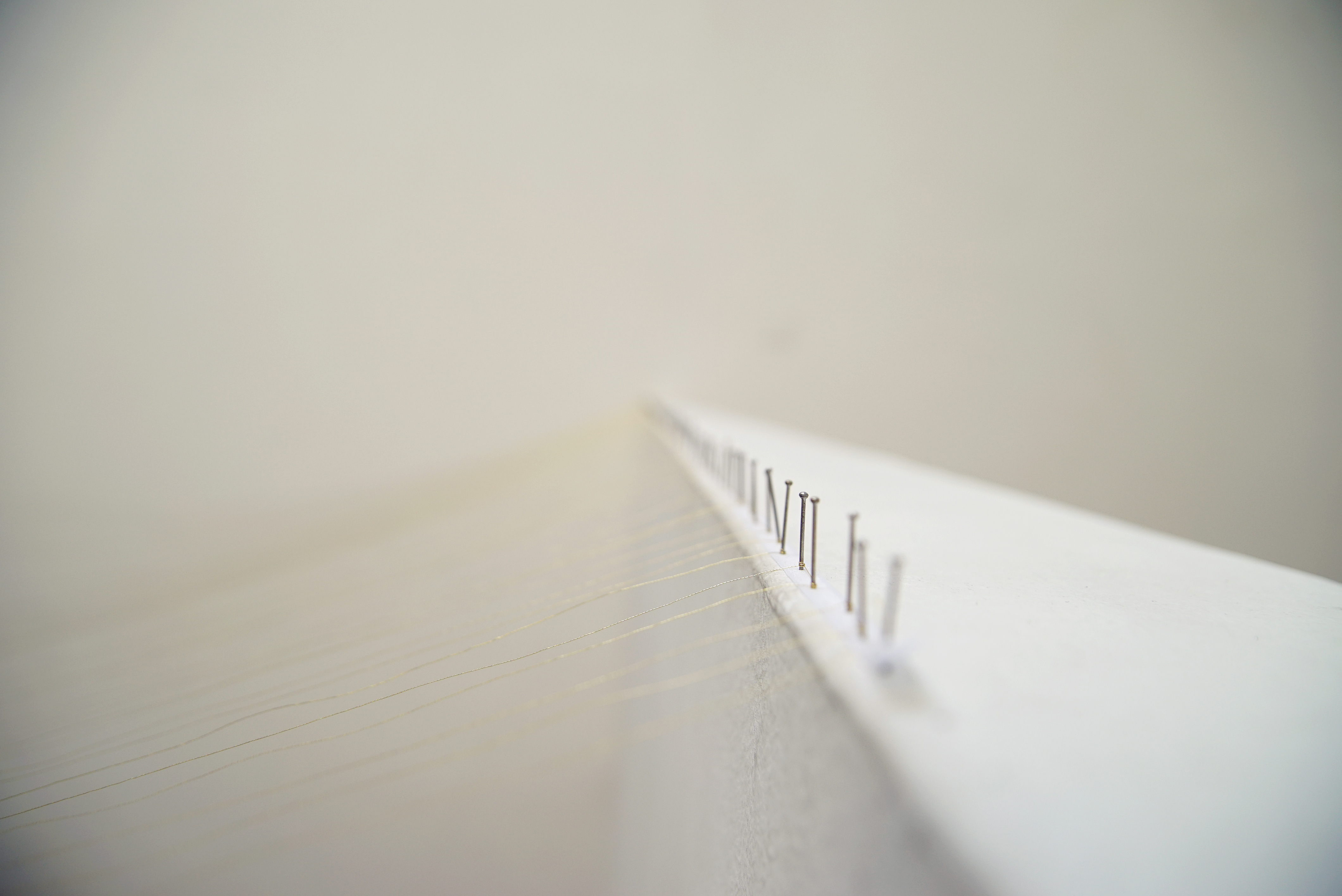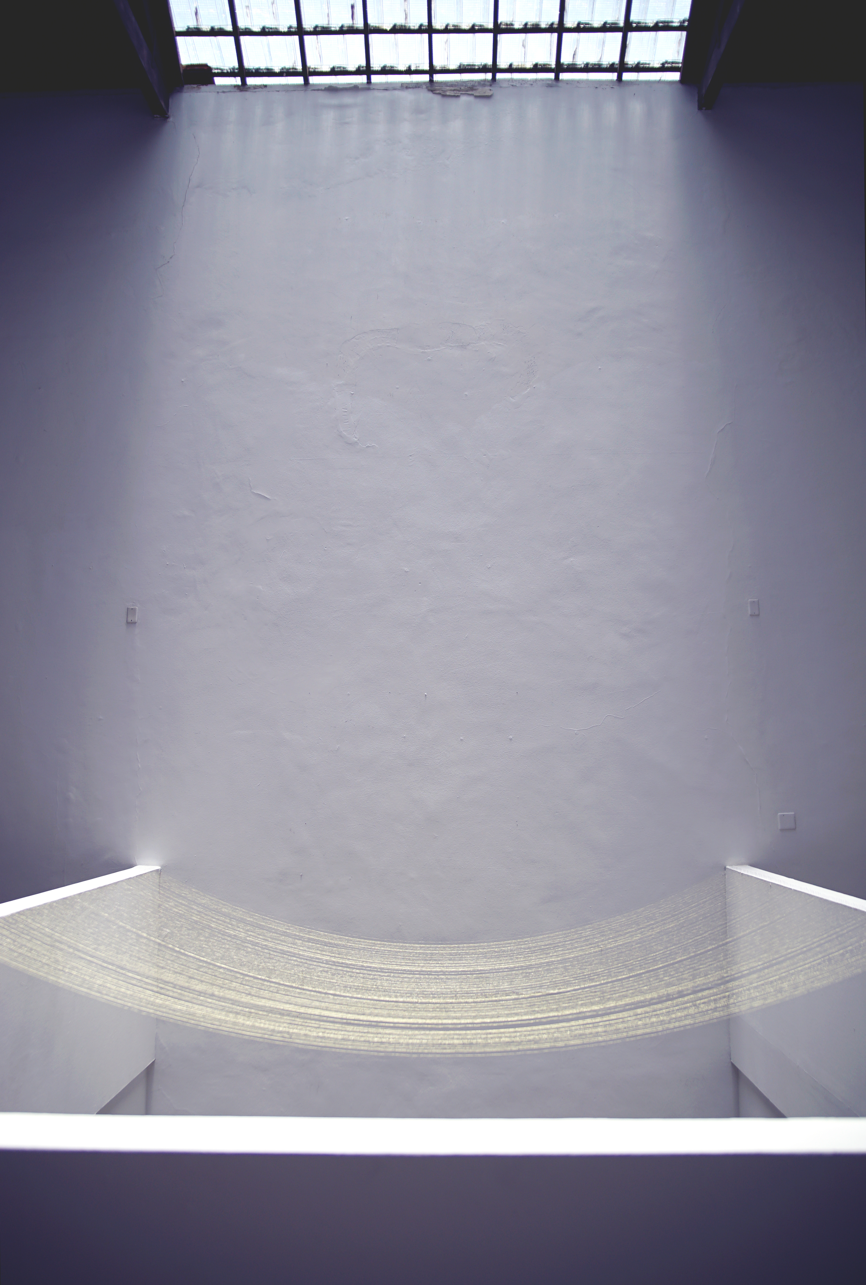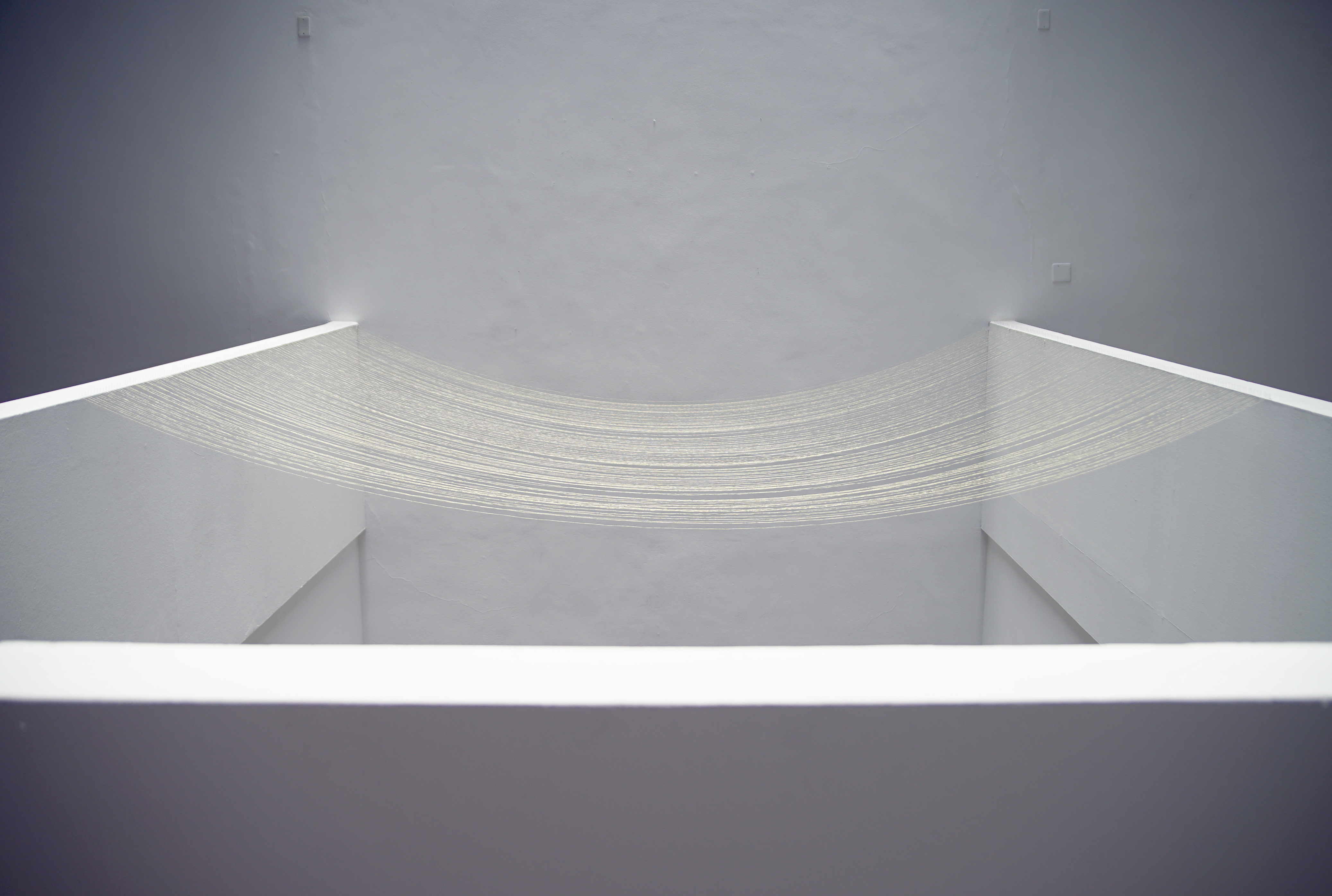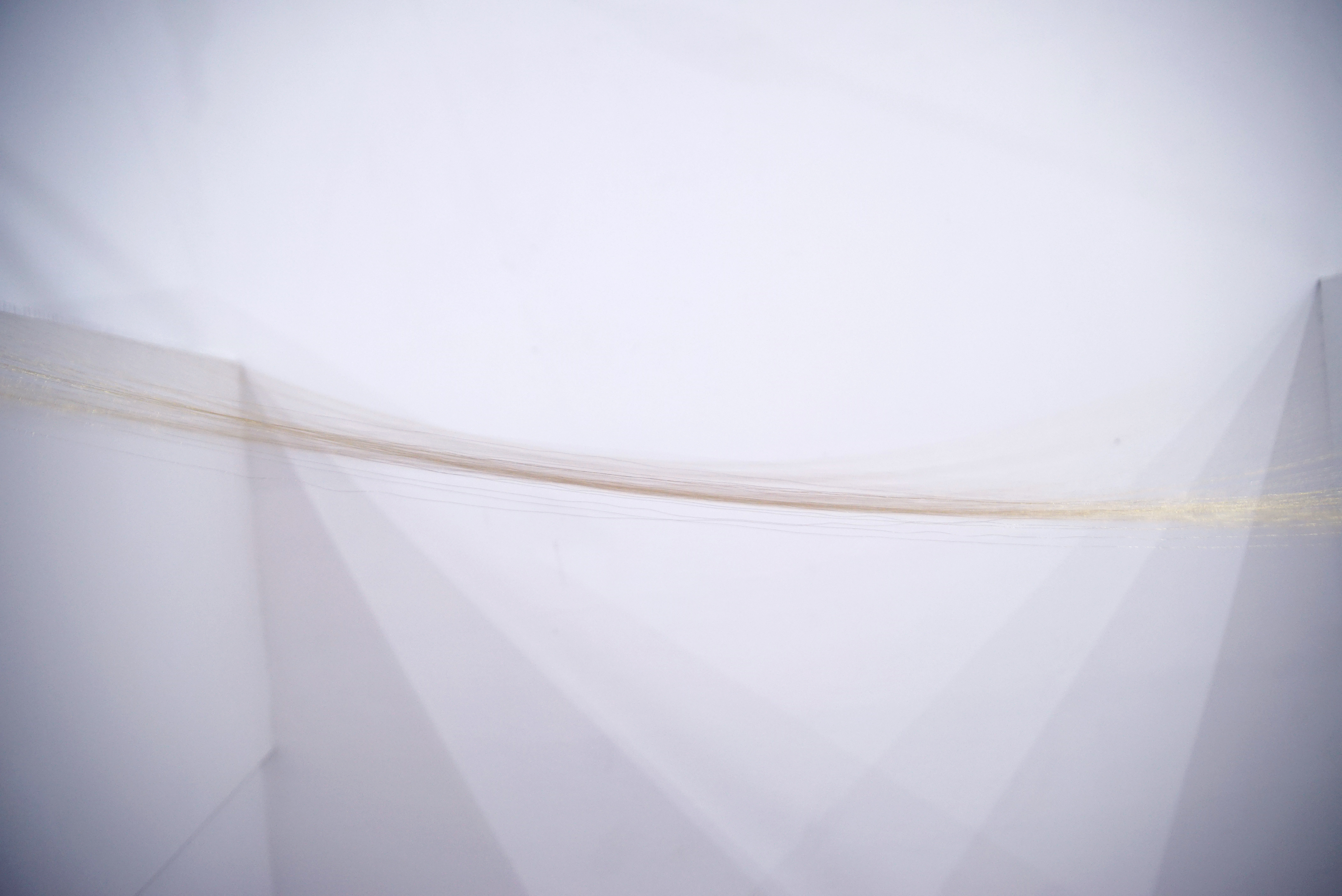 階段上の空間に、200本の金色の糸を三次曲面状に懸垂。太陽光と見る角度により、現れ、消える。観客の動きや微風によって微かに揺らぐ。