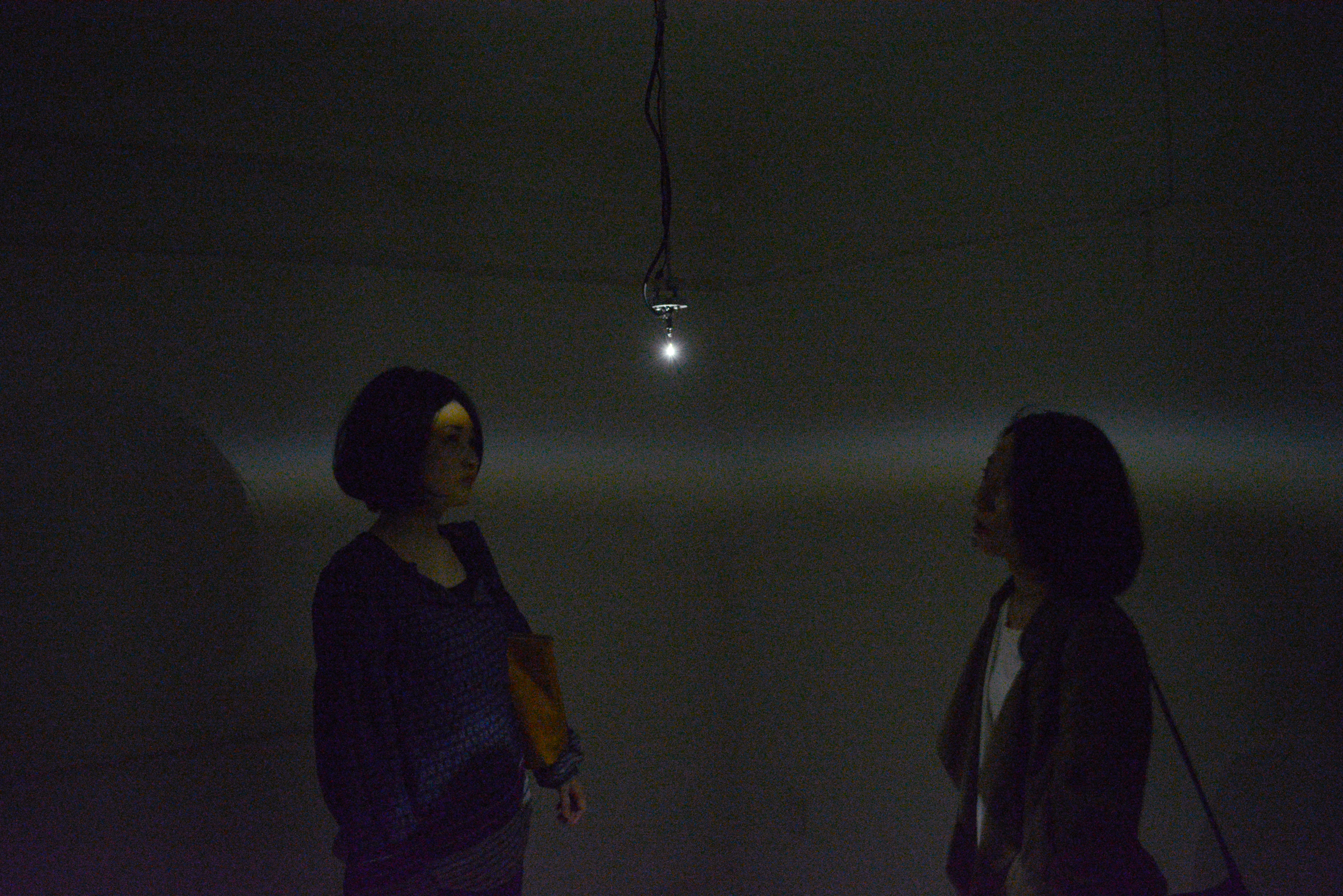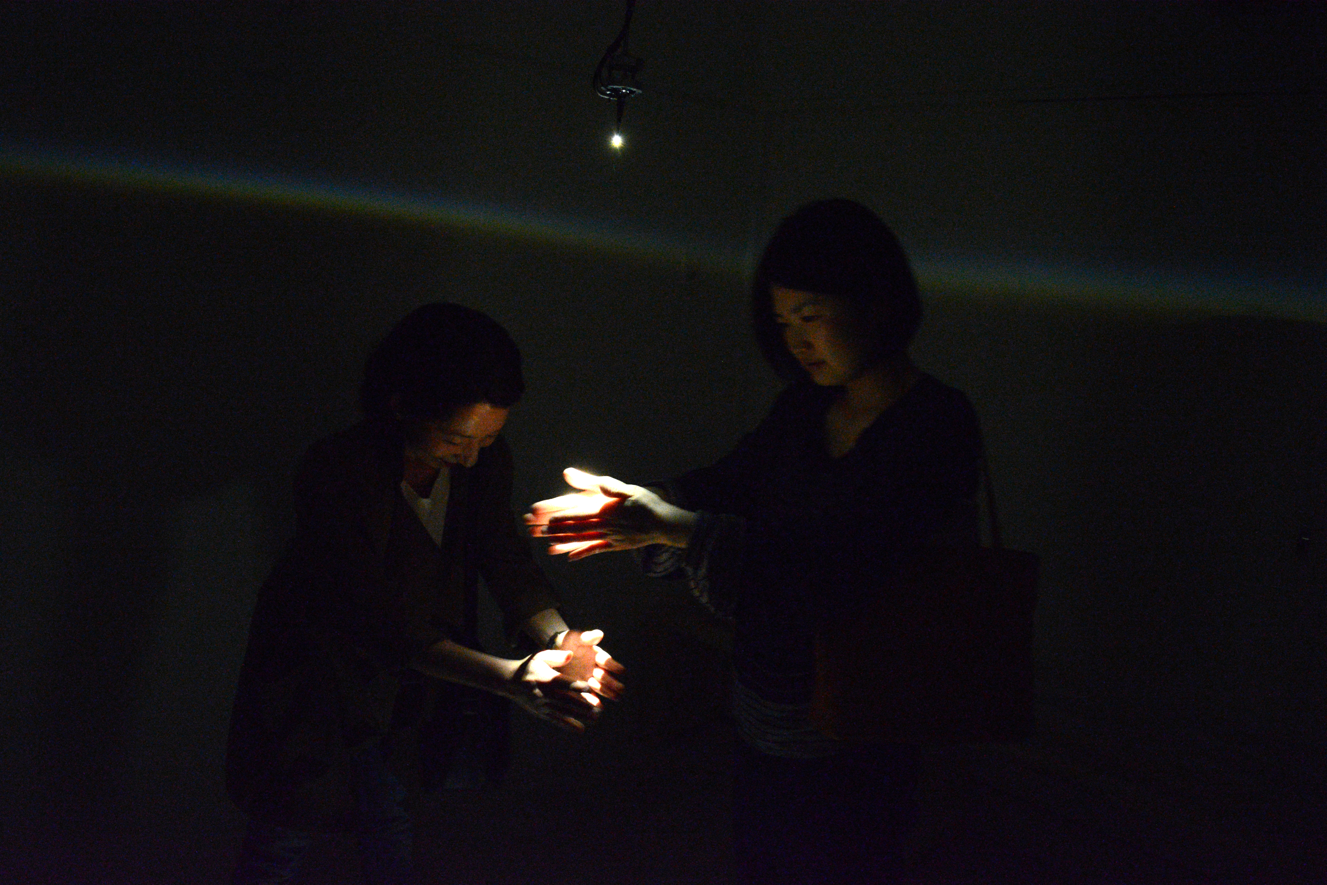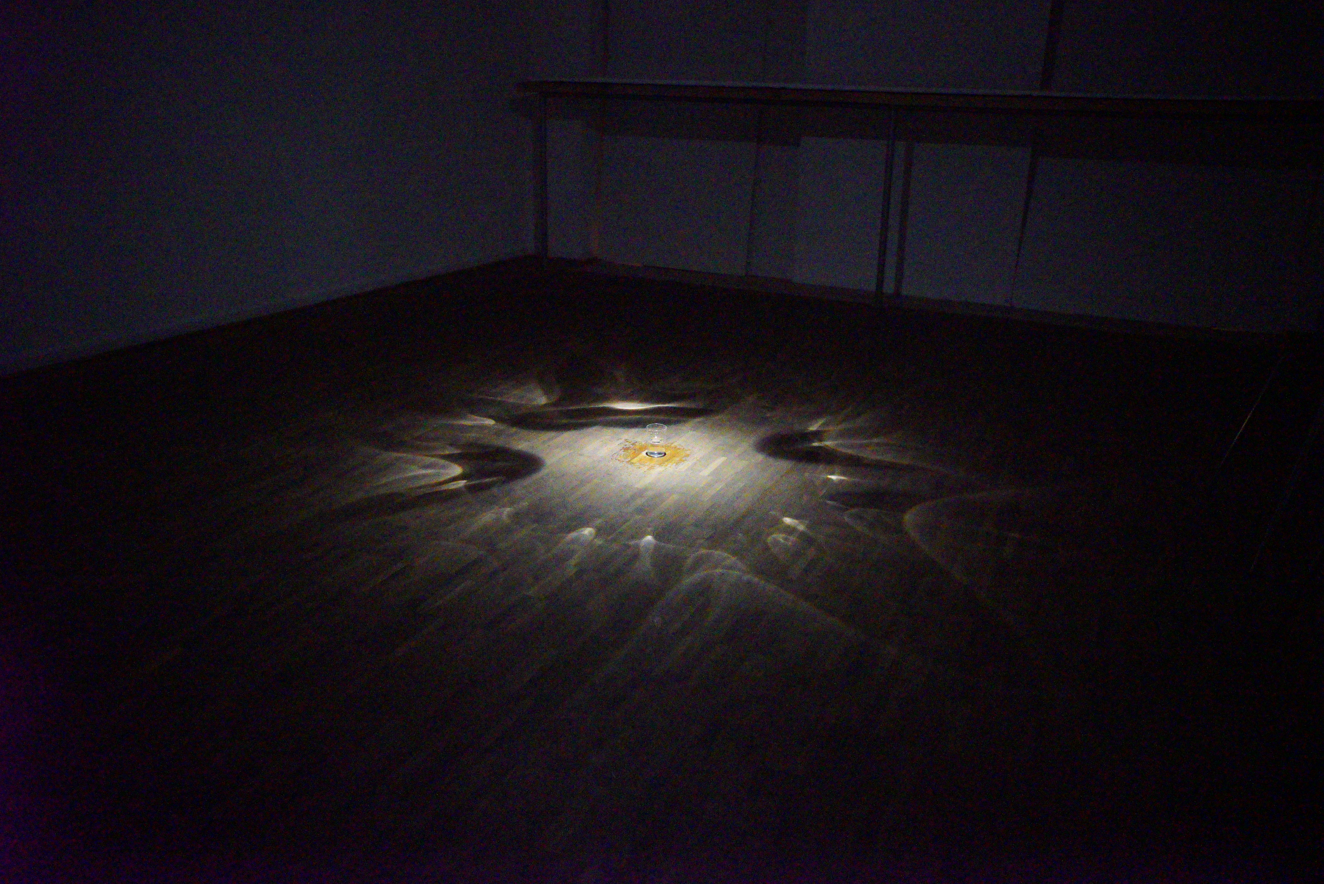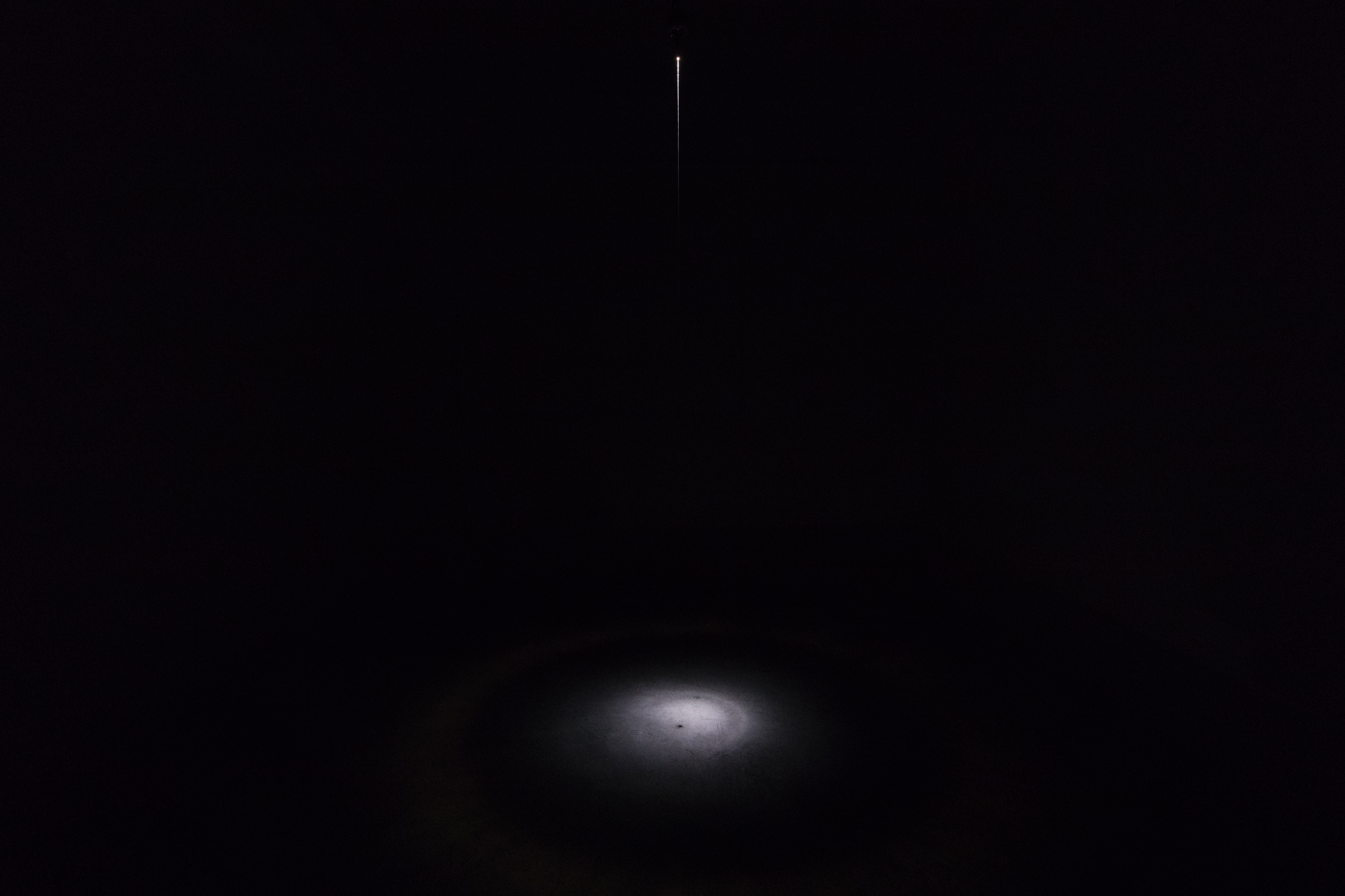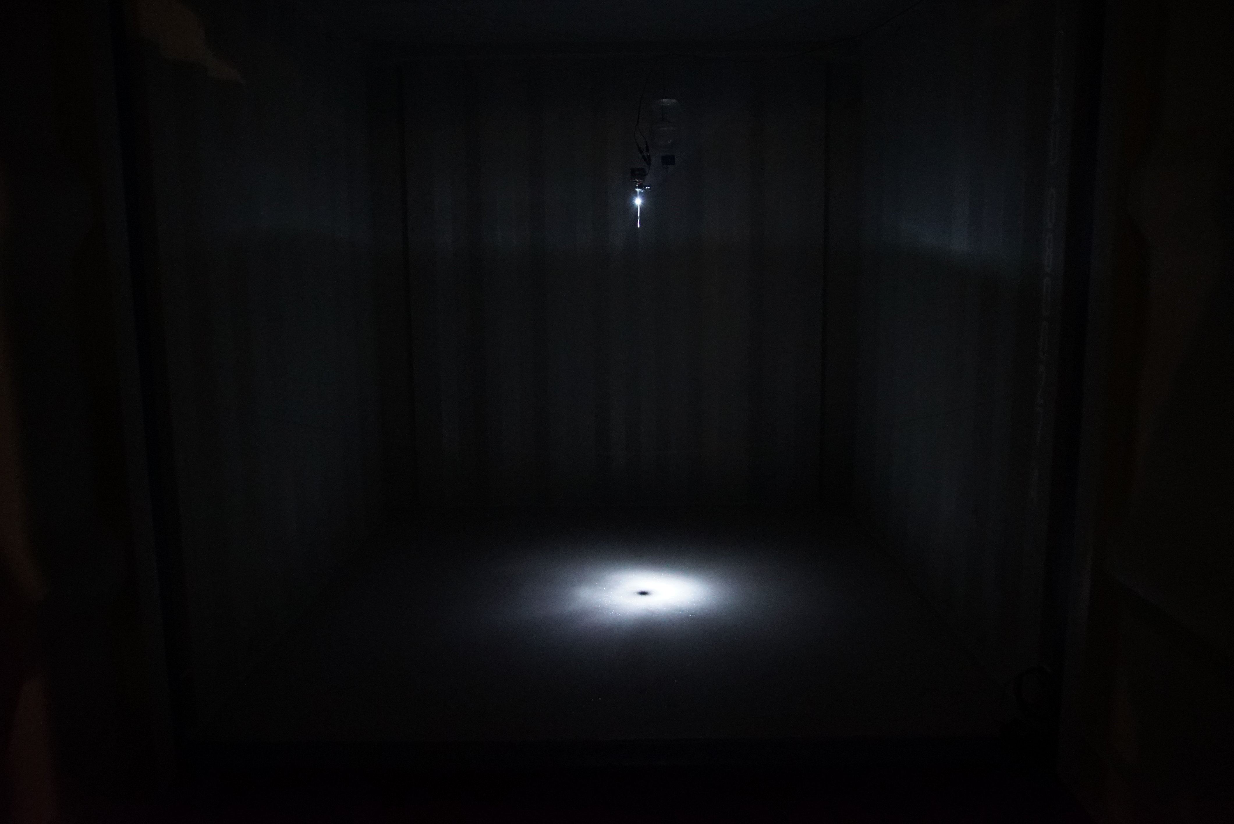 Dripping water droplets function as a lens with a constantly shifting refractive index, projecting patterns of light on the floor and walls that change continuously. Thanks to the minute changes inside the water droplets, the same pattern never appears twice. In this work, the relationship between the main elements that comprise the universe — light, space, and time — are connected to each other through gravity and the surface tension of water. <D.W>